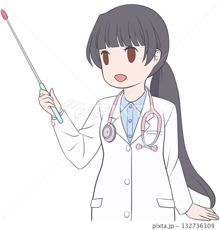 指し棒を持った笑顔の女性医師。ポインターで説明する若い女性のクリップアート