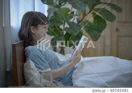 ベッドで読書する女性