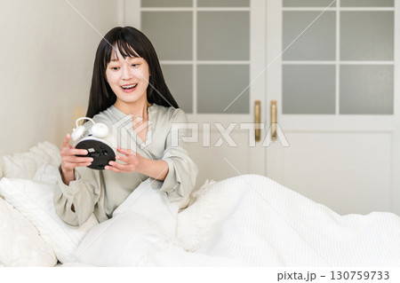 目覚まし時計を見て驚くびっくりする若いアジア人女性(寝坊,遅刻,寝過ごす)