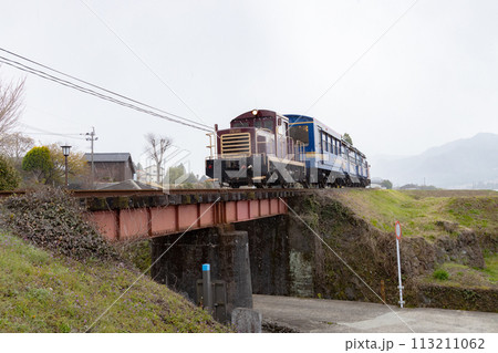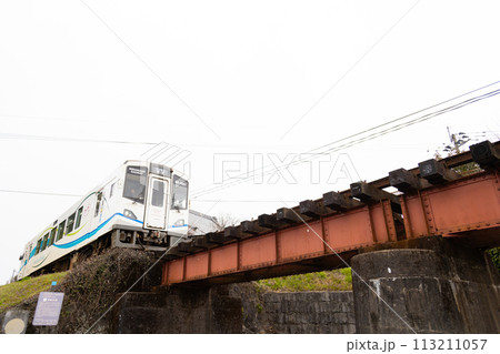 熊本県の南阿蘇鉄道 一両の列車が走る寺坂水源の鉄橋を通る
