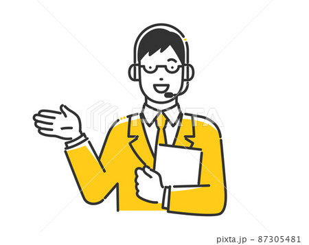 笑顔で人差し指を立てているテレフォンオペレーターの男性