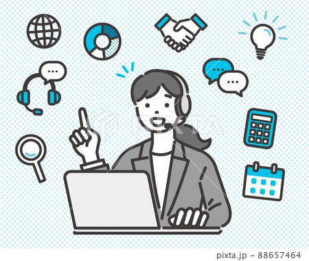 ビジネスアイコンとコールセンターで働く女性オペレーターのベクターイラスト素材/サービス/説明/ビジネ