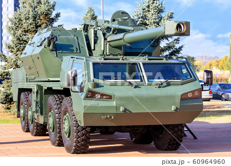 Self-propelled artillery is parked in the parking