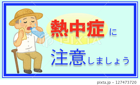 熱中症になりかけ休憩し水分補給をするおじいちゃん(16:9横長バナー・熱中症テキスト入り)