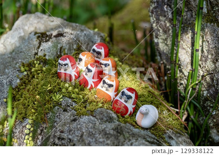 縁起の良いだるまと白蛇が並ぶ日本の風景