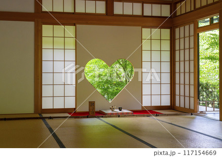 新緑を映す猪目窓のある和室