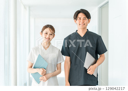 スクラブ姿の医療従事者,医療スタッフ,医師の男性と白衣姿の看護師の女性