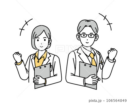 ガッツポーズをする白衣を着た男女の医師