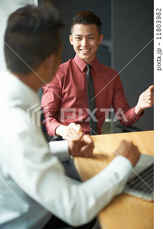 A young Asian man in shirt and tie was been lectured by a Asian mature man in urban setup