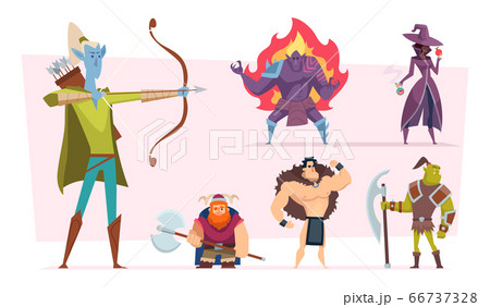 Fantasy characters. Fairytale humans and creatures elf orc demon giant vector cartoon personages