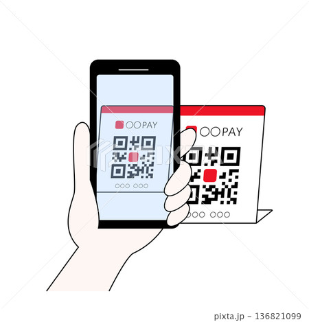 線ありカラーで描かれた店舗のQRコードをスマホで読み取る手のイラスト