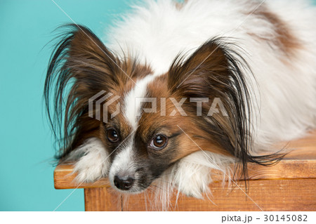 Studio portrait of a small yawning puppy Papillon