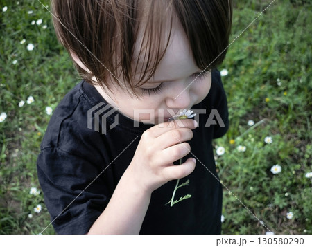 Happy little baby boy outdoor fun. A cute child enjoying summer flowers in a green field.