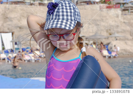 Little adorable child girl enjoying summer in the beach. High quality photo