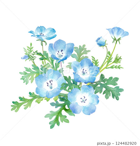 春の花:ネモフィラの水彩イラスト。切り花のアソート。(ベクター。花と葉の別レイヤー)