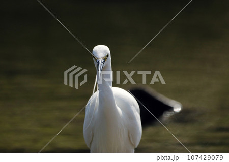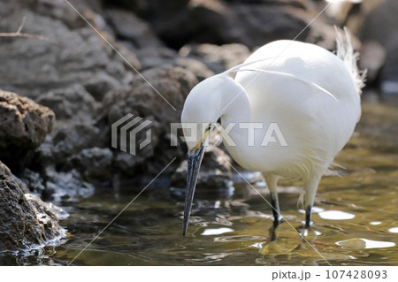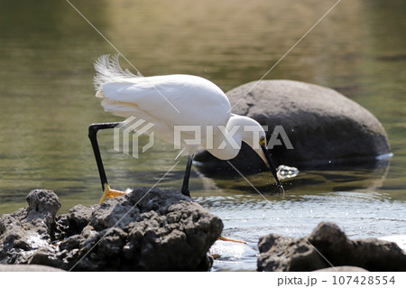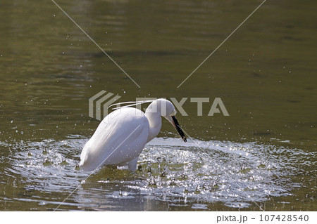 池で小エビを捕らえて食べる1羽のコサギ(シラサギ)