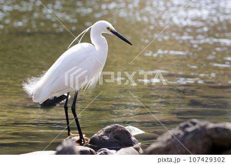 池で岩の上に立つ1羽のコサギ(シラサギ)の後姿