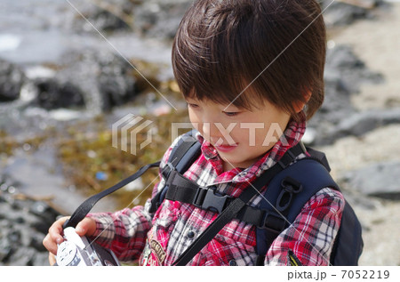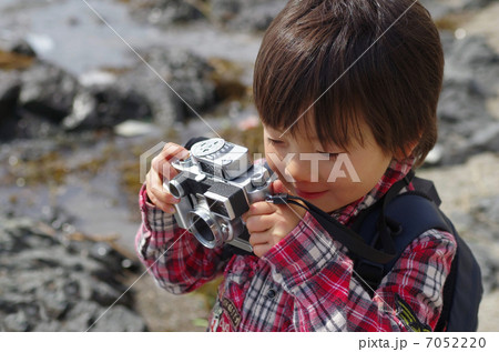 海岸で撮影する子供。小さなカメラマン(三浦半島、長浜海岸)