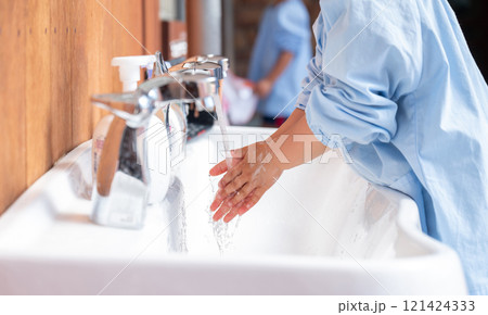 コロナウィルス予防のための消毒液、台の上に置かれている