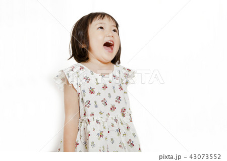 両手を上げ驚いている、ワンピースの幼い女の子。驚き、ビックリ、ショック、喜び、衝撃のポーズ