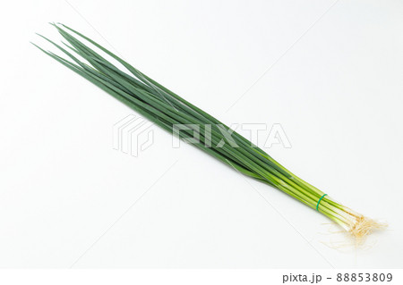 竹ざるに乗せた福岡県産小ねぎ 白バック 白背景