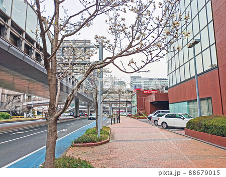 北九州市のJR小倉駅北側コブシ咲く市街地風景