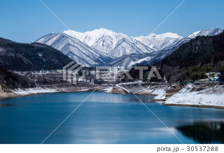猿ヶ京温泉にある赤谷湖と雪山の風景