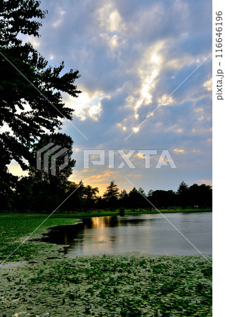 東京 都立水元公園 曇り空の夕刻 天使の梯子の風景