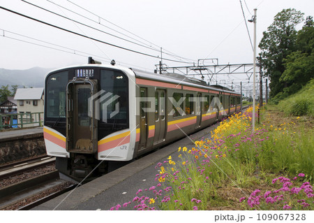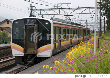 初夏の大沢駅に到着する上越線E129系電車(新潟県南魚沼市)
