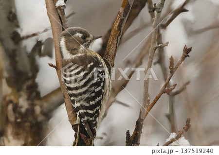 冬の森でエサを探すコゲラ こげら キツツキ 北海道野鳥