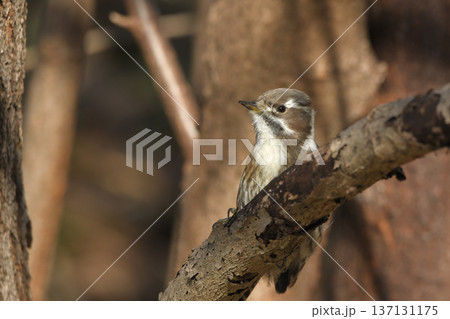 埼玉県川越市池辺 川越水上公園 修景池(ボート池)の周りの木の幹をつつくキツツキの一種コゲラ
