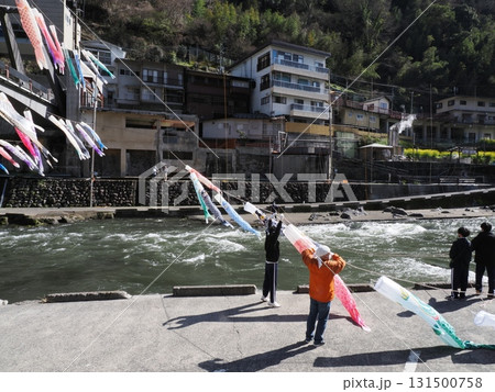 掲げる瞬間 ― 杖立温泉、こいのぼり設営と川辺の人々