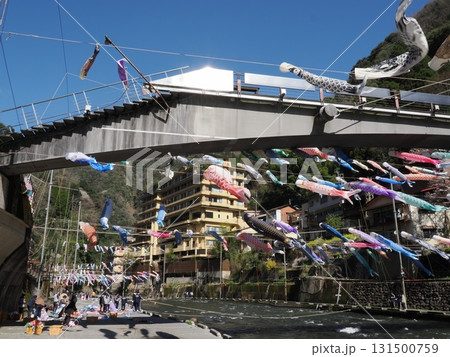 橋を渡るこいのぼり ― 杖立温泉、川辺の人々と町の祝祭