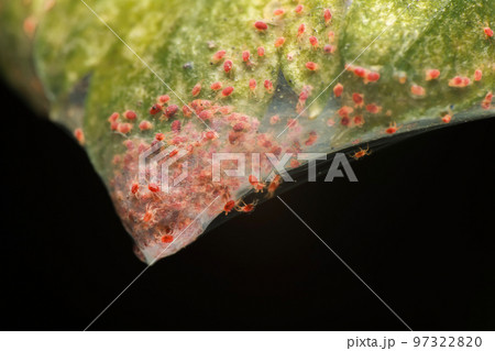 Super macro photo group of Red Spider Mite infestation on vegetable. Insect concept.