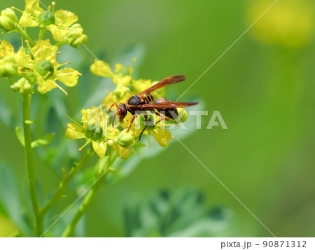 生き物 昆虫 フタモンアシナガバチ、子育てのため狩りをしますが花の蜜が大好きです