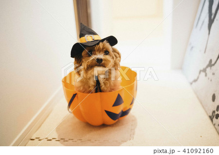 ハロウィンの仮装してかぼちゃの入れ物に入っているチワプー