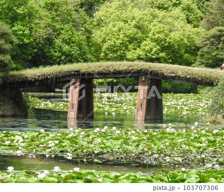岡山県津山市にある回遊式日本庭園「衆楽園」:園内の土橋