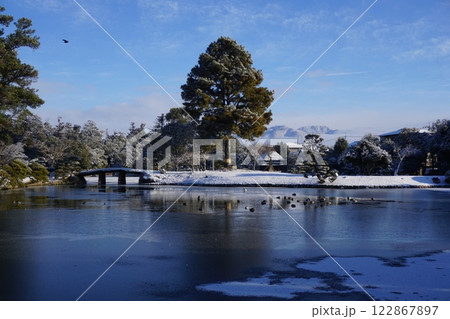 岡山県津山市にある回遊式日本庭園「衆楽園」:雪景色