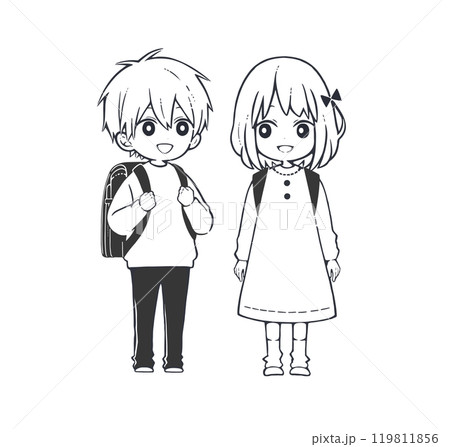 ランドセルを背負った小学生の男の子と女の子 モノクロイラスト