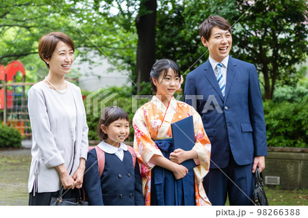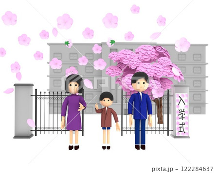 桜が咲く小学校の入学式。校門の前に立ち、記念写真を撮影する親子