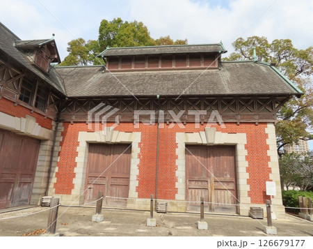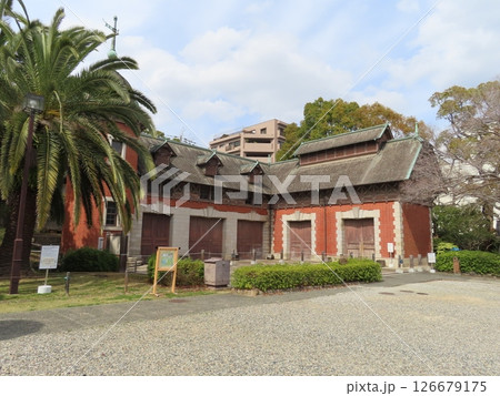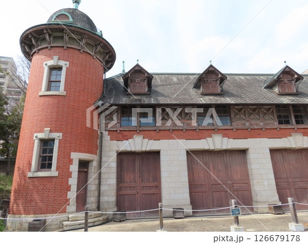 赤茶色のレンガの相楽園の旧小寺家厩舎、重要文化財、神戸市の都市公園で唯一の日本庭園