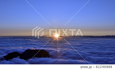 燕岳のテント場から見たご来光と雲海と富士山と八ヶ岳と南アルプス