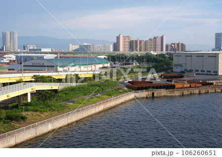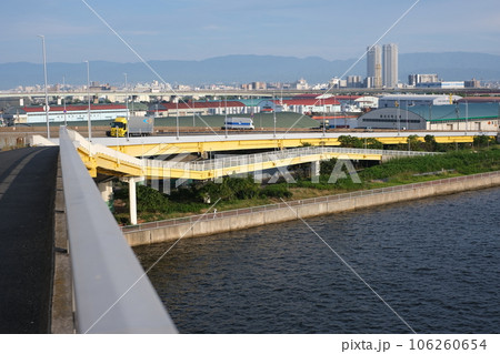 大阪 泉大津 泉大津大橋から望む倉庫群と船(小松埠頭)(春)