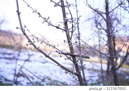 Background from bare branches of a bush. Bush without leaves. Buds on branches. Plant in winter in the south.