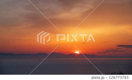 朝焼けの朝 対岸の山並みから昇る朝日 光る海