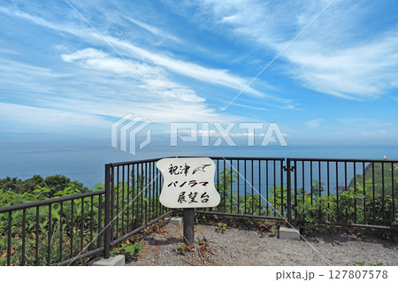 断崖絶壁の入り江の岩場と遠くに見える水平線