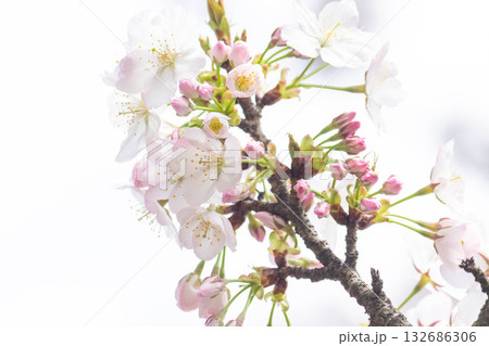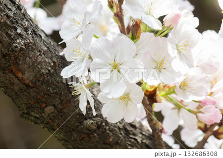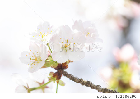 太陽の光りのあたる白い花びらの小汐(塩)山という桜をアップで撮影した風景