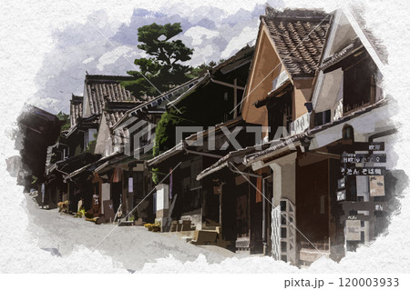 水彩画風 吹屋の町並み 下谷地区 岡山県高梁市