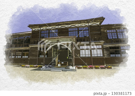 水彩画風 旧吹屋小学校 旧プール 岡山県高梁市