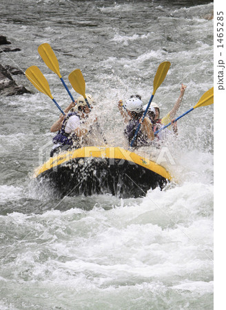 長瀞荒川、ライン下りの船が水しぶきを上げて小滝の瀬を通過する